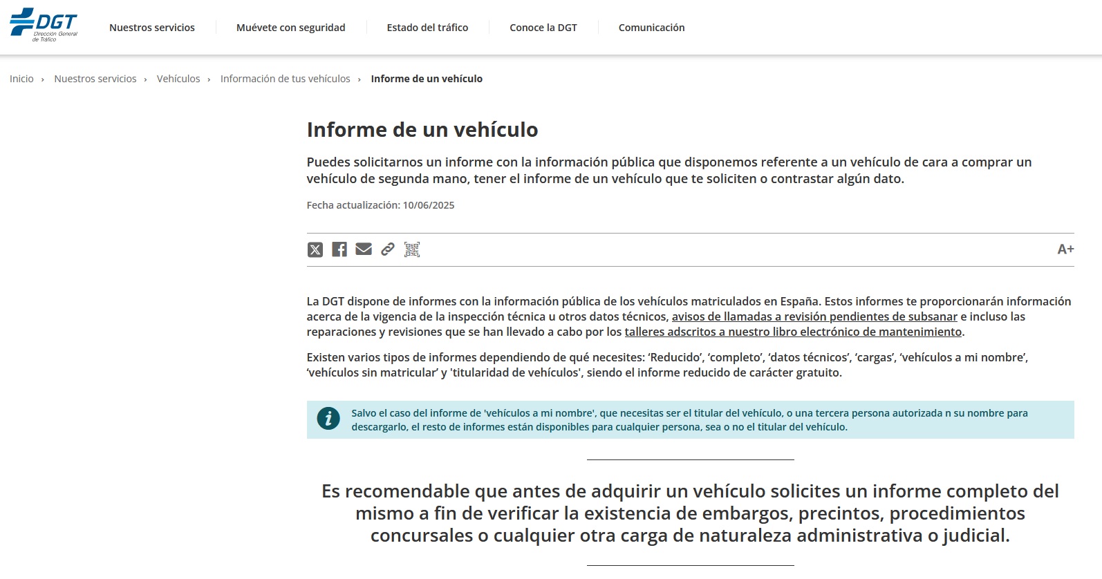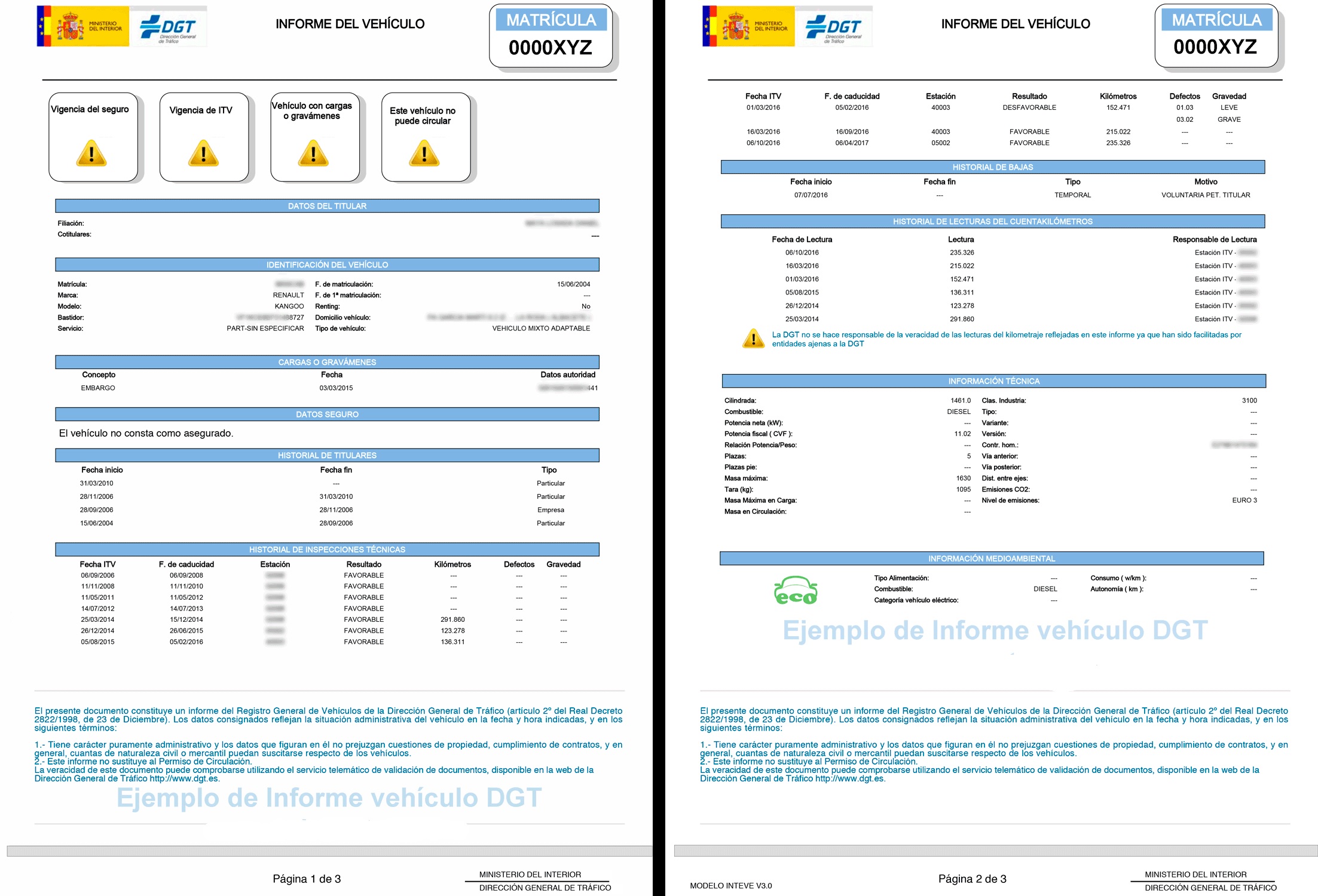 Antes de adquirir un vehículo de segunda mano o incluso uno mediante un contrato de renting con opción a compra, se recomienda solicitar un informe completo de la DGT. El presente documento incorpora datos relativos al propietario, historial de Inspección Técnica de Vehículos, kilometraje, embargos, reservas de dominio y cualquier otra limitación asociada.