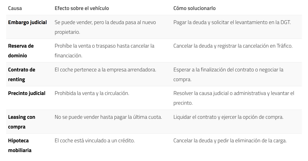 - Con reserva de dominio del coche, leasing, hipoteca o renting, la venta está prohibida hasta resolver la situación.