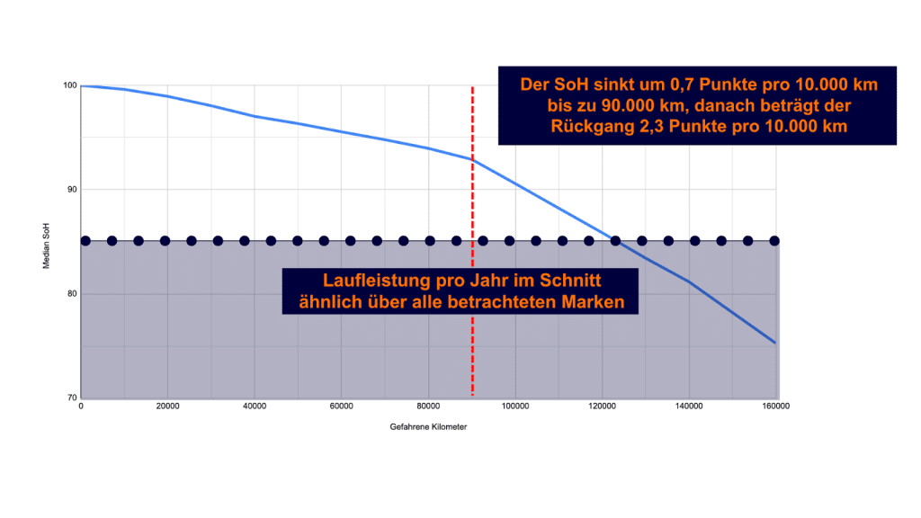 Varios estudios han puesto de manifiesto que las baterías se conservan mejor de lo esperado. No obstante, el aspecto más relevante de dichos estudios ha sido la identificación de un punto de inflexión claro en su desgaste. Durante los primeros 90.000 kilómetros, la degradación es relativamente contenida, con una pérdida media de apenas 0,7 puntos de SoH por cada 10.000 kilómetros recorridos. Sin embargo, a partir de dicho umbral, el deterioro se acelera de forma notable, alcanzando una media de 2,3 puntos por cada 10.000 kilómetros.