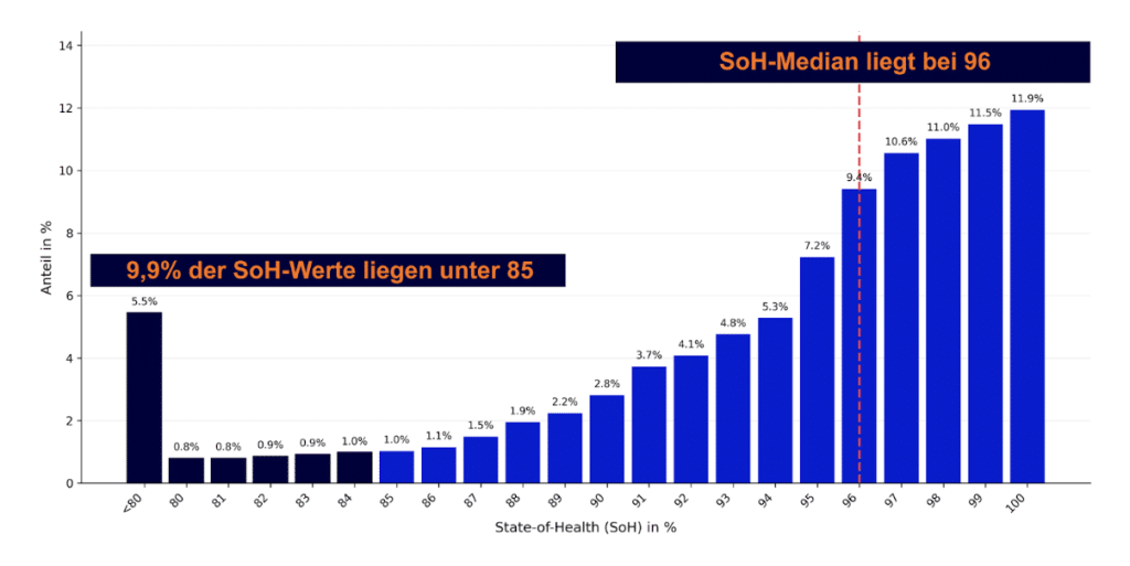 Como conclusión principal, se ha determinado que la mediana del estado de salud de las baterías examinadas se sitúa en 96 puntos, lo que indica un nivel de degradación significativamente bajo en la mayoría de los casos. En efecto, únicamente el 9,9% de los vehículos exhibe un SoH por debajo de 85 puntos, umbral a partir del cual el rendimiento comienza a deteriorarse de manera significativa.
