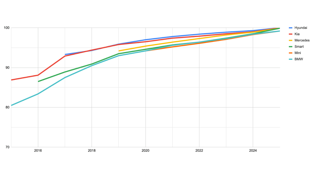 Marcas como Hyundai, Kia y Mercedes-Benz se distinguen por exhibir valores de SoH elevados, incluso en vehículos de mayor antigüedad, con valores que oscilan entre 90 y más de 95 puntos, y alcanzando casi el 100 en modelos recientes.