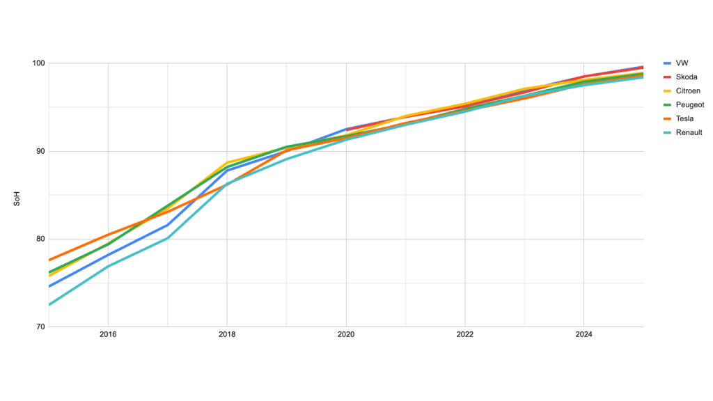El estudio ha examinado el estado de salud (SoH) de las baterías de aproximadamente 50.000 vehículos eléctricos a batería e híbridos enchufables, todos ellos fabricados entre 2016 y 2026.