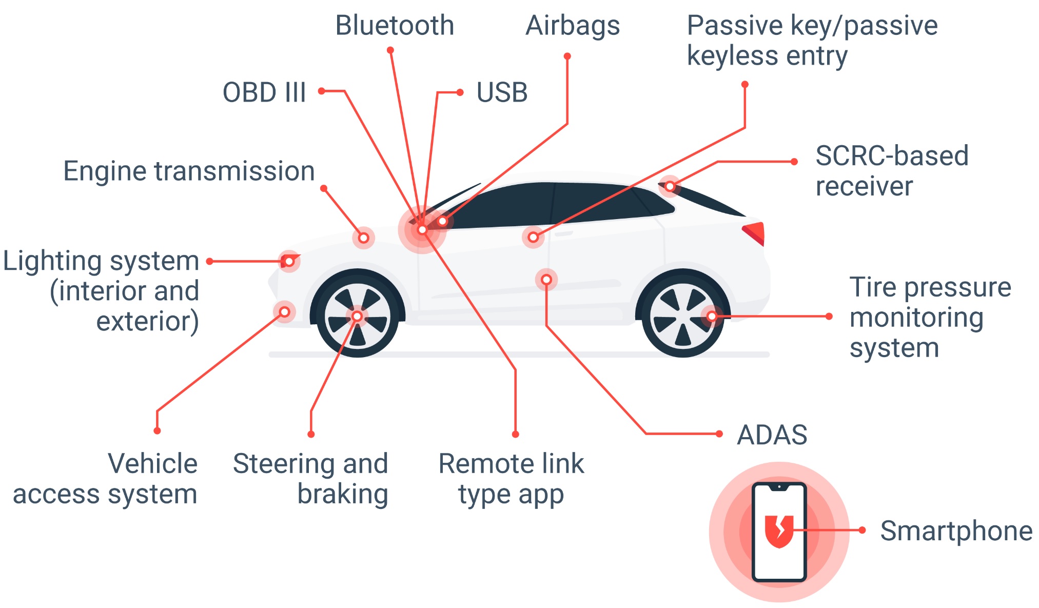 Attackers can take control of critical systems such as the accelerator, brakes, or steering, which can lead to serious accidents.