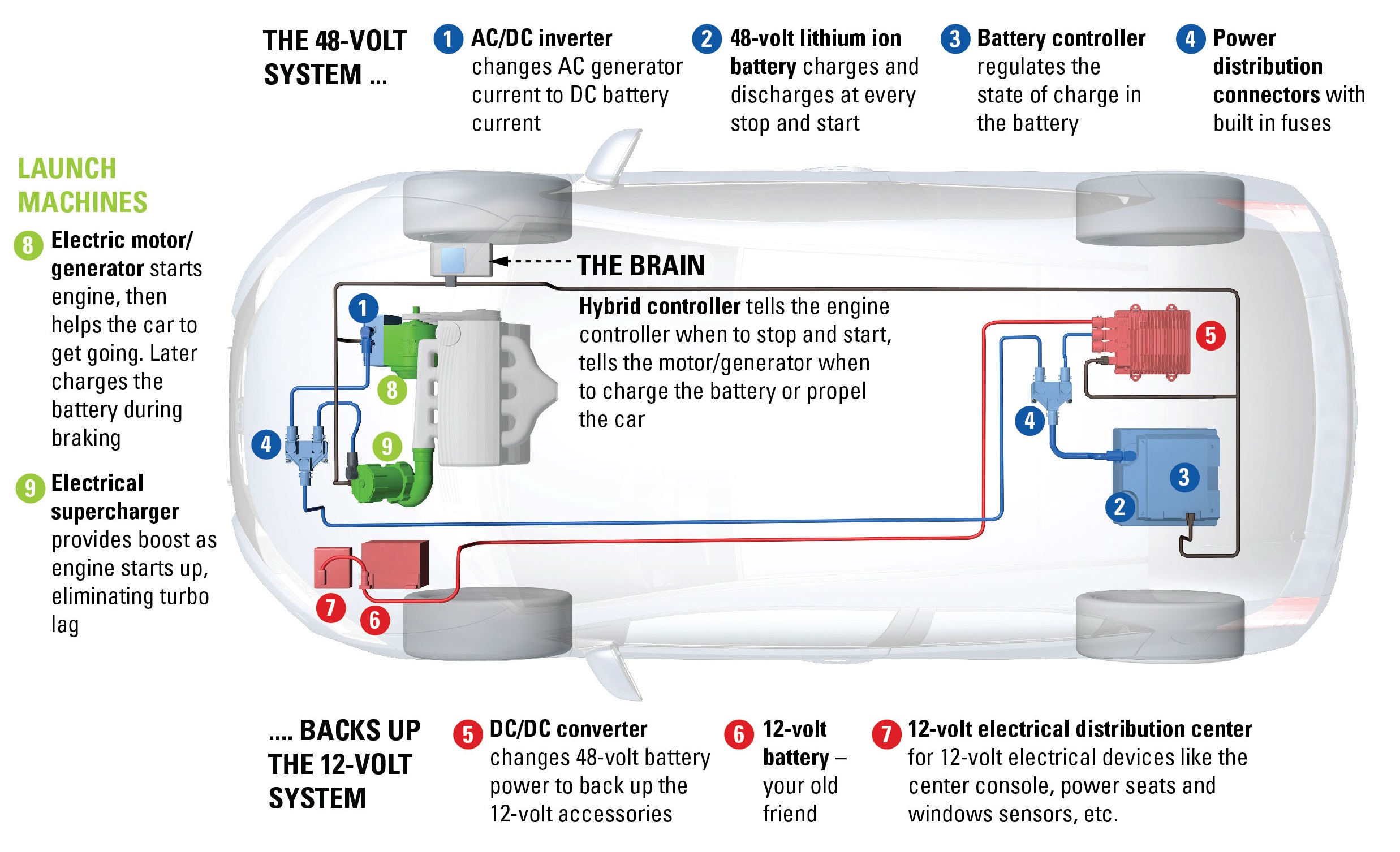 The 48V battery is an essential component of the system, as it provides the energy needed to power the mild hybrid electrical system. It also facilitates the starter-alternator or starter generator’s assistance to the internal combustion engine during acceleration, energy recovery, and other functions, such as coasting with the engine off. Audi explains, for example, that its mild-hybrid system is based on a 48V lithium-ion battery and a starter-generator with a capacity of up to 9 kW and 50 Nm. Similarly, Volkswagen notes that energy recovered during braking is stored in a dedicated battery, which is then reused while driving.