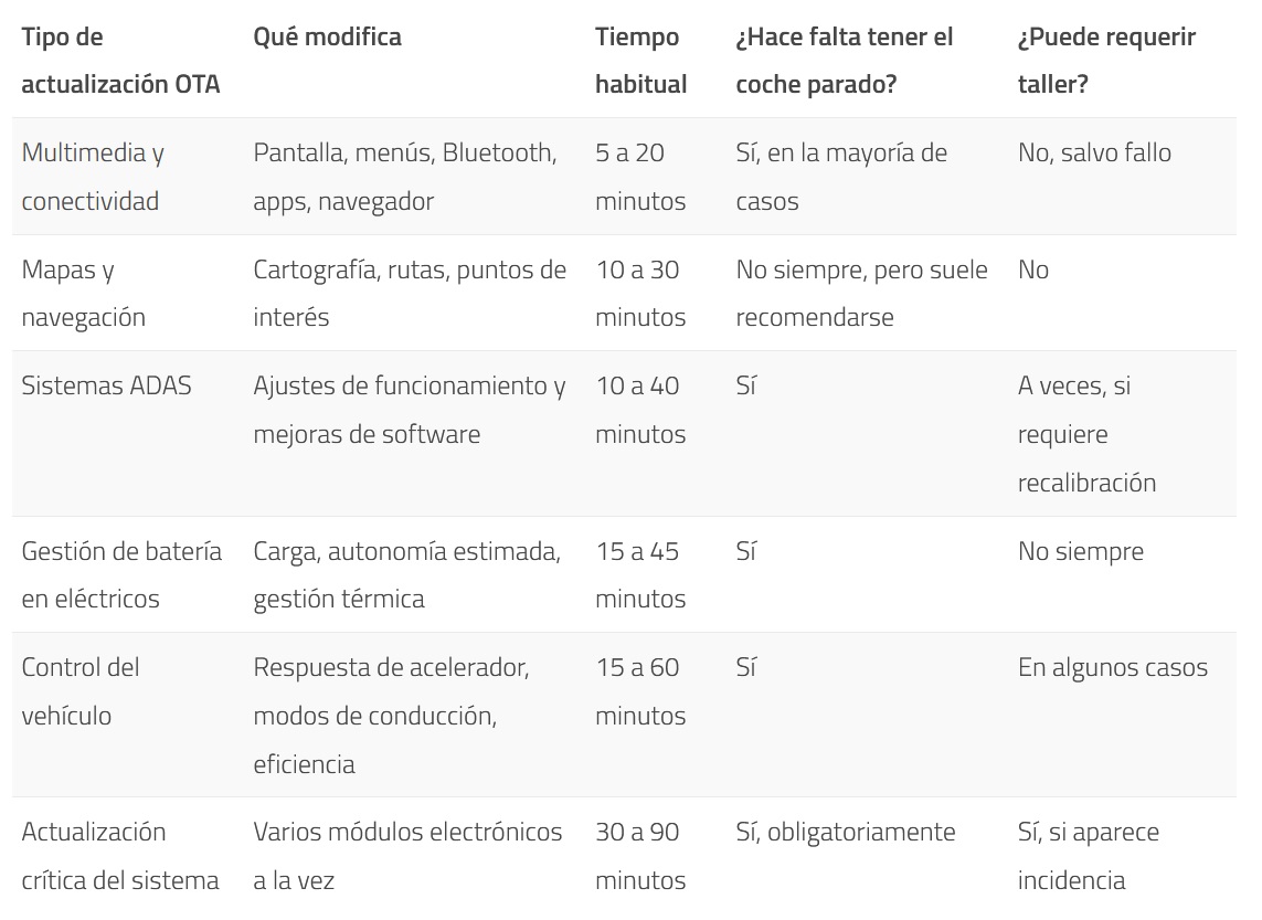 Por otro lado, las actualizaciones más significativas pueden afectar a múltiples módulos electrónicos o a funciones más críticas del vehículo. En tales circunstancias, el tiempo de instalación tiende a prolongarse y el fabricante puede requerir condiciones particulares, tales como un nivel mínimo de batería o una ventana específica con el vehículo estacionado.